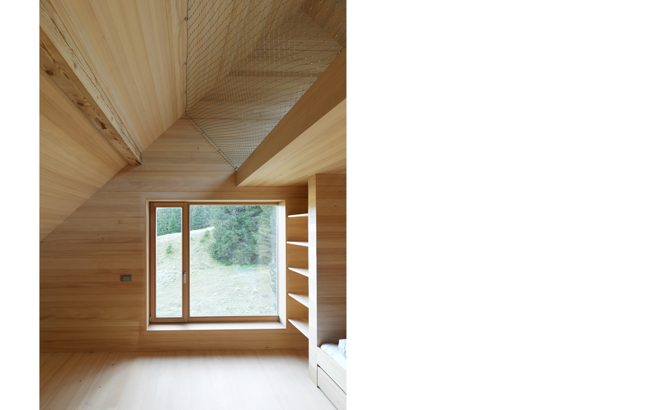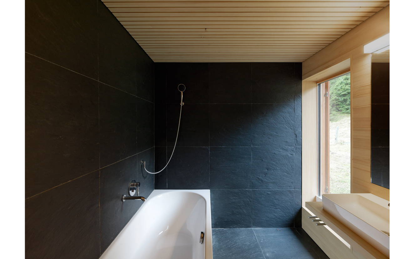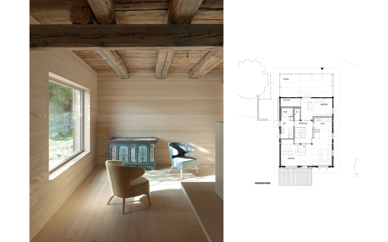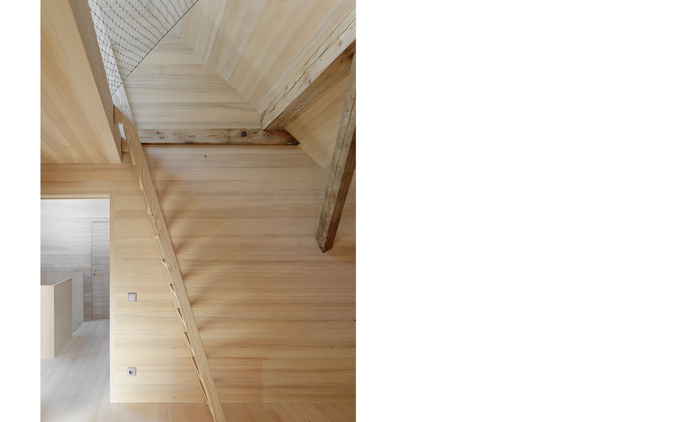 Auf die aktuell übliche technische Aufrüstung verzichtend, setzt die Sanierung eines Stallgebäudes stattdessen auf die atmosphärische Qualität der Innenräume. Auf relativ engem Raum entwickeln sich im Erdgeschoß rund um einen gemauerten Ofen großzügige Raumabfolgen, die in den unerwartet vielfältigen Raumschichtungen des Obergeschoßes mit seinen Schlafgalerien ihre Fortsetzung finden.