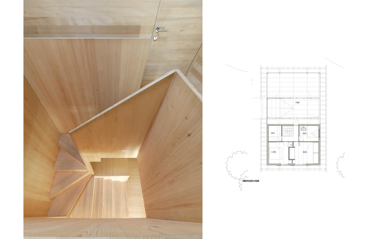 Präzise gesetzte neue Fensteröffnungen, eine leicht schwebende zentrale Stiege, die auch als Stauraum dient, und der sorgfältige Innenausbau aus Weißtanne tragen ihr Übriges dazu bei, dass hier ein unkon- ventionelles Vorzeigeprojekt entstanden ist.